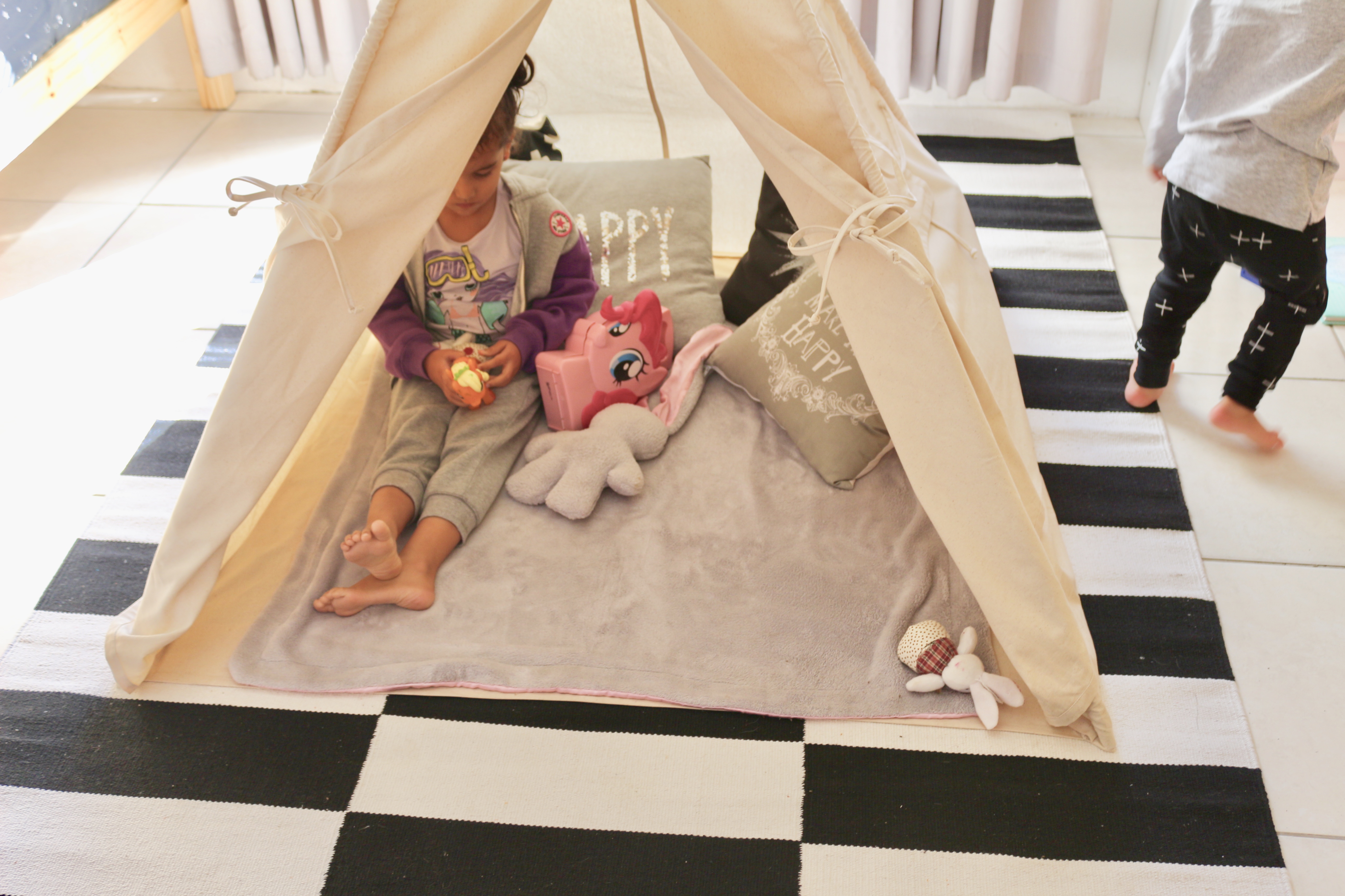 We decided to get her a teepee, that could be her “escape” from little bro and she has surely laid down the law with him. Does he listen though?