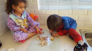 Each day without fail, Alyssa and Aidan are helping Dad (and on the rare occasion Mom) cook Dinner. They help Dad cut up the veggies, measure the ingredients and spice the food. While they are “cooking” they are also tasting the raw veggies and chatting about the textures.